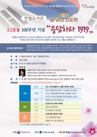 안산시 반월도서관은 문화체육관광부가 주최하고 한국도서관협회가 주관하는 ‘2019 길 위의 인문학’ 공모사업에 지원기관으로 선정돼, 3.1운동 100주년 기념 인문학 프로그램을 진행한다고 8일 밝혔다.