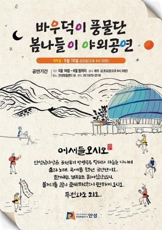 안성남사당 바우덕이 풍물단은 오는 10일부터 6월말까지 보개면 안성맞춤랜드 광장에서 매주 금요일과 토요일 저녁 8시 30분에 야외 야간공연을 펼친다.