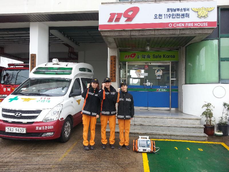 17일 10시경 포항시 남구 문덕로에 위치한 아파트 공사현장 2층에서 김모씨(남,34세)가 쓰러졌다는 신고를 받고 출동한 오천119안전센터 구급대는 현장 도착하여 환자 상태 확인한바 심정지 상태로 인지되어 곧장 호흡·맥박이 없는 환자에게 자동제새동기(AED)를 이용하여 2차례의 전기충격과 심폐소생술 끝에 환자의 귀중한 생명을 구하여 병원으로 이송하였고 현재 환자는 의식회복 된 상태로 입원치료 중에 있으며 지난 11일 심정지 상태에서 회복된 성모씨(남,67세)는 퇴원 후 정상활동 중인 것으로 알려졌다.