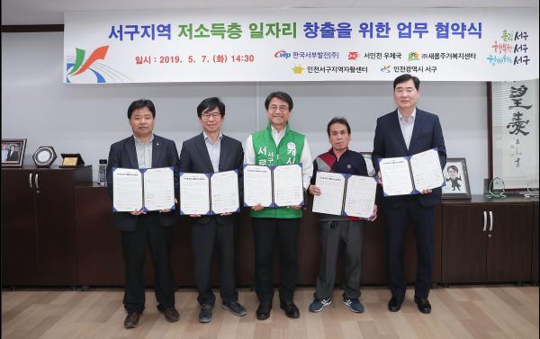 인천 서구는 한국서부발전 서인천발전본부, 경인지방우정청 서인천우체국, ㈜새롬주거복지센터, 인천서구지역자활센터 등 5개 기관과 서구지역의 저소득층에게 일자리 제공을 위한 업무 협약식을 지난 7일 개최했다고 밝혔다.
