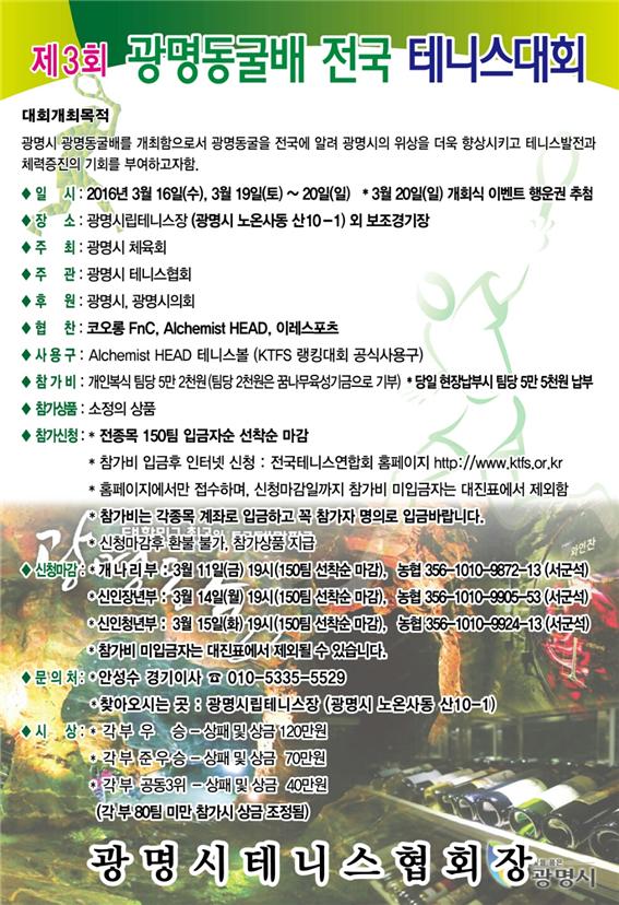 광명시 테니스협회 관계자는 “이번 전국대회를 성황리 잘 마쳐 테니스 저변확대와 광명동굴을 알리는데 노력하겠다”고 밝혔다.