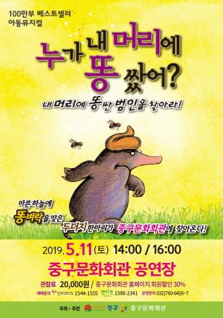 오는 11일 중구문화회관에서 어린이들을 위해 준비한 특별한 선물, 어린이 뮤지컬 ‘누가 내머리에 똥 쌌어’가 펼쳐진다.