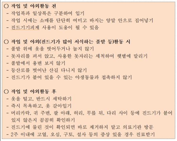 특히, SFTS 감염자 중에는 50대 이상의 농업 및 임업 종사자의 비율이 높아 농촌지역 고연령층에서 주의가 필요하며, 야외활동 후 2주 이내에 고열, 소화기증상이 있을 경우 즉시 의료기관을 방문해 진료를 받아야 한다.
