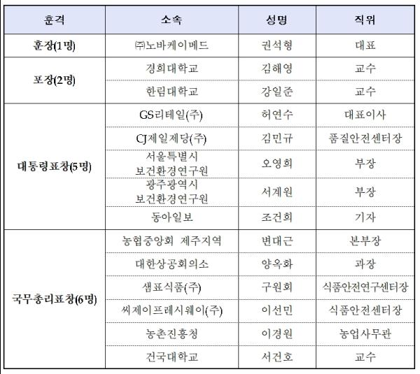 아울러 식품산업 발전에 크게 공헌한 ㈜노바케이메드 권석형 대표에게 산업훈장, 경희대학교 김해영 교수와 한림대학교 강일준 교수에게 근정포장, 서울특별시 보건환경연구원 오영희 부장 등 5명에게 대통령 표창, 국무총리 표창 6명 등 식품안전 유공자 총 148명에게 훈·포장 및 표창이 수여될 예정이다.