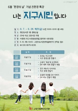 고양시 행신도서관이 제24회 환경의 날을 맞아 오는 6월 7일부터 28일까지 매주 금요일 오전 10시, 20세 이상의 지역주민을 대상으로 친환경 특강 ‘나는 지구시민입니다’를 운영한다.
