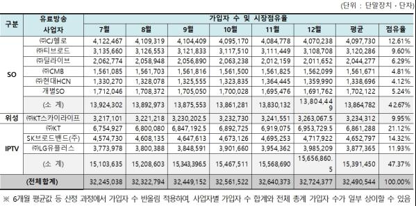 또한, 매체별 6개월간 평균 가입자 수는 IPTV 15,391,450명, SO 13,864,782명, 위성방송 3,234,312명순으로 나타났다.