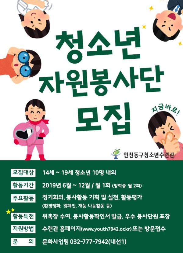 인천 동구 청소년수련관에서는 14세 이상 19세 이하의 청소년을 대상으로 청소년자원봉사단 신입 단원을 모집한다고 9일 밝혔다.