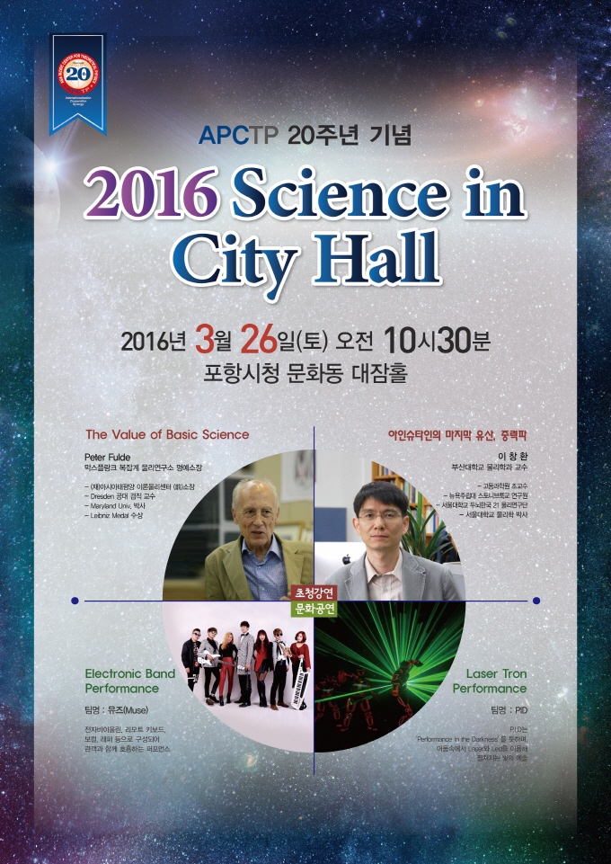 지난 2008년부터 14회째 개최되고 있는 포항의 대표 과학문화 행사인 ‘과학자와의 만남(Scienc in City Hall)’이 오는 26일 오전10시30분 부터 포항시청 문화동 대잠홀에서 열린다. ‘Science in City Hall’ 행사는 포항시와 (재)아시아태평양이론물리센터가 함께 진행하며, 유익한 과학강연과 재미있는 과학문화공연으로 시민들에게 과학적 정보전달과 흥미를 전달할 계획이다. 특히 올해는 (재)아시아태평양이론물리센터의 창립 20주년을 맞아 특별 초청한 독일의 Perter Fulde APCTP 명예소장(막스플랑크 복잡계연구소 명예소장)의 기초과학의 중요성을 알리는 ‘The Value of Basic Science’ 강연이 펼쳐진다. 또 최근 과학계의 이슈인 중력파 검출실험 성공의 역사와 원리를 풀이하는 부산대학교 이창환 교수의 ‘아이슈타인의 마지막 유산, 중력파’ 강연이 이어진다. 2부에서는 전자바이올린, 리모트 키보드, 보컬 등으로 구성된 전자밴드 ‘MUSE’의 화려한 전자현악 연주와 빛과 레이저의 창의적 활용이 돋보이는 암전(暗轉)레이저 퍼포먼스 ‘PID’팀의 공연이 참가자들에게 재미와 즐거움을 선사할 계획이다. 이범훈 아시아태평양이론물리센터 소장은 “포항시민과 청소년들에게 기초과학의 중요성과 과학에 대한 흥미를 알리고, 과학적 소양을 더하는 유익한 프로그램이 준비되어 있으니 과학문화에 관심있는 학생들과 시민들의 많은 관람을 부탁한다”고 말했다.