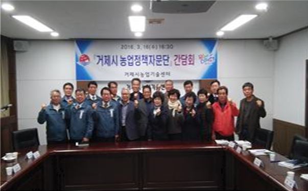 한편, ‘거제시 농업정책자문단’은 지역 내 농업현장의 목소리를 대변할 수 있는 농업인 관련 단체장 및 농업인을 위원으로 농업현장 모니터 역할과 농업정책 방향 자문활동을 통한 농정개선 및 발전방안 등 지역농업의 경쟁력 향상을 도모하고자 2013년도 구성되어 현재 2기 17명의 농정자문단으로 운영 중이며, 사안 발생 시 행정과 수시 협의체를 가동, 정보를 상호 공유하여 신속히 대안을 찾는 자율적인 조직체로서 우리지역 농업실정에 부합되는 농정 구심체로서의 역할을 수행하고 있다.