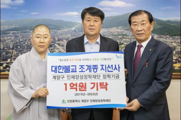 인천 계양구 인재양성장학재단은 지난 8일, 대한불교 조계종 지선사에서 향후 5년간 1억 원의 장학금을 기탁하기로 약정하고 2천만 원을 전달했다고 10일 밝혔다.