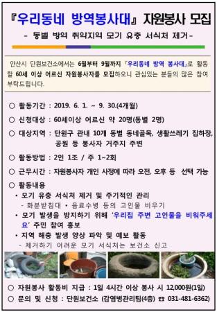 안산시 단원보건소는 하절기 모기 등 위생해충 방제를 위해 ‘우리동네 방역 봉사대’로 활동할 60세 이상 어르신 자원봉사자 20명을 모집한다.