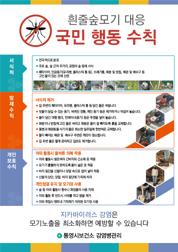 이에 통영시보건소는 모기활동 시기 전인 4월말까지 유충방제를 위한 주요 서식처를 집중 방제하고, 흰줄숲모기 국민행동수칙을 전파를 위해 현수막, 전단지, 홍보물 등을 제작하여 배포하는 등 모기 매개 감염병 예방을 위해 지속적인 홍보와 예방활동에 철저를 기할 방침이라고 밝히며, 흰줄숲모기 서식지 제거 및 집주변 환경정비에 시민 모두가 참여 할 수 있도록 동참을 요청했다.