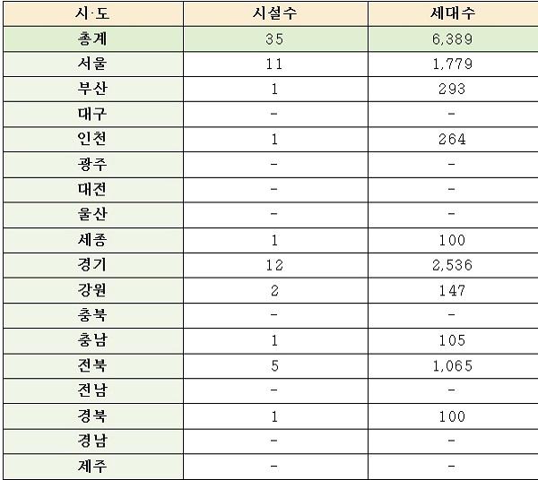 시·도별로 구체적으로 보면, 경기도가 12개 시설 2,536세대로 가장 많고, 서울 11개 시설 1,779세대, 부산 1개 시설 293세대, 인천 1개 시설 264세대, 세종 1개 시설 100세대, 강원 2개 시설 147세대, 충남 1개 시설 105세대, 전북 5개 시설 1,065세대, 경북 1개 시설 100세대가 공급되어 있다. 대구, 광주, 대전, 울산, 충북, 전남, 경남, 제주에는 노인복지주택 공급이 없는 것으로 나타났다.