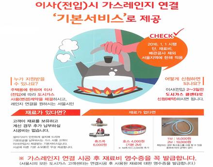 이사(전입)시 도시가스 무료연결 서비스를 받으려면 해당지역 도시가스 콜센터(공급권역 및 전화번호 참조)로 이사 2~3일전 연락하면 되며 단 한 번의 방문으로 각 가정에서는 가스레인지 연결서비스와 함께 안전점검, 가스사용자 명의변경 등의 모든 서비스를 동시에 받을 수 있다.