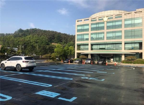 이번 주차장 정비는 청사 주차장 포장상태와 설치된 시설이 노후화됨에 따라 실시됐다. 주차공간을 2.3m에서 2.5m로 확대하고 특히 2중 주차선을 도입했다.