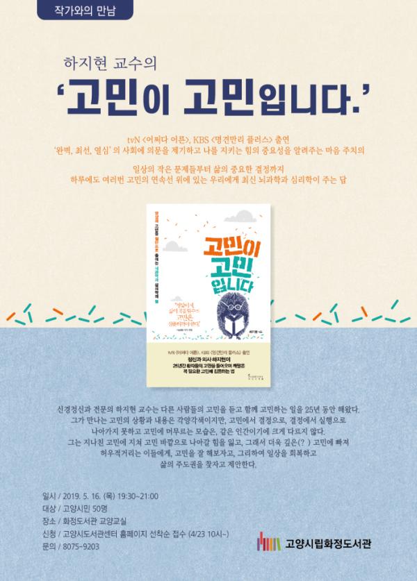 고양시 화정도서관에서는 심리학분야 베스트셀러 ‘고민이 고민입니다’의 저자 하지현 교수와 ‘작가와의 만남’을 갖는다.