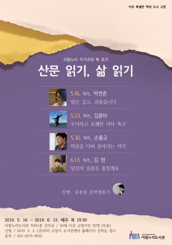 고양시 아람누리도서관에서는 5월 16일부터 4주간 매주 목요일 저녁마다 작가초대 북토크 ‘산문 읽기, 삶 읽기’가 열린다.