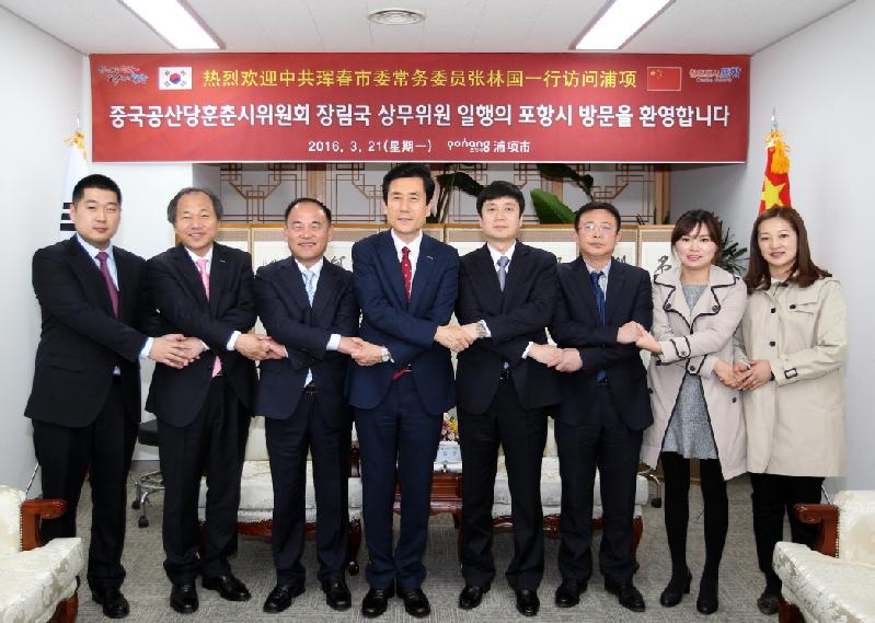 포항시와 자매도시인 중국 훈춘시의 장린궈 상무위원 일행이 인적교류 및 페리항로 개설에 따른 업무협의를 위해 지난3월 21일부터 23일까지 포항을 방문했다. 방문단은 지난21일 시청을 방문해 이강덕 시장과 면담을 가지고 포항시와 훈춘시 간의 국제교류 및 페리항로 개설을 위한 여러 가지 방안에 대해 의견을 교환했다. 이어 22일에는 훈춘시 상무위원 일행, 경상북도, 포항시, 포항지방해양수산청, 포항항만물류협회, 포항해양문화관광협의회, 포항영일신항만(주), 장금상선, 흥아해운 등 관계자가 참석한 가운데 영일만항~자루비노항~훈춘시 간 페리항로개설을 위한 T/F팀 1차 회의를 가졌다. 이날 회의에서 참석자들은 환동해는 1억 6천만명이 거주하는 경제중심지로서 러시아, 중국, 한국의 물류시장 확대 및 해외관광객의 교류의 활성화가 필수적이라는 것에 의견을 모았다. 다음 회의는 오는 7월 28일부터 31일까지 개최되는 포항국제불빛축제에 항만 및 물류관련 CEO 및 관계 공무원들이 참석해 항로개설 및 상생방안을 심도 있게 논의할 기회를 가지기로 했다. 이강덕 시장은 “훈춘시와는 1995년 자매도시 체결을 한 이래로 인적교류를 비롯해 다양한 협력을 이어오고 있다”며 “지역경제 활성화를 위해서는 환동해 페리항로 개설이 필요하고, 훈춘시와 포항시가 적극적인 협력을 해야한다”고 말했다. 장린궈 상무위원은 “훈춘시의 환동해 페리항로 개설의 입장은 확고하며 포항시와 인적교류, 물류교류 등 활발한 업무 협력을 희망한다”고 말했다.