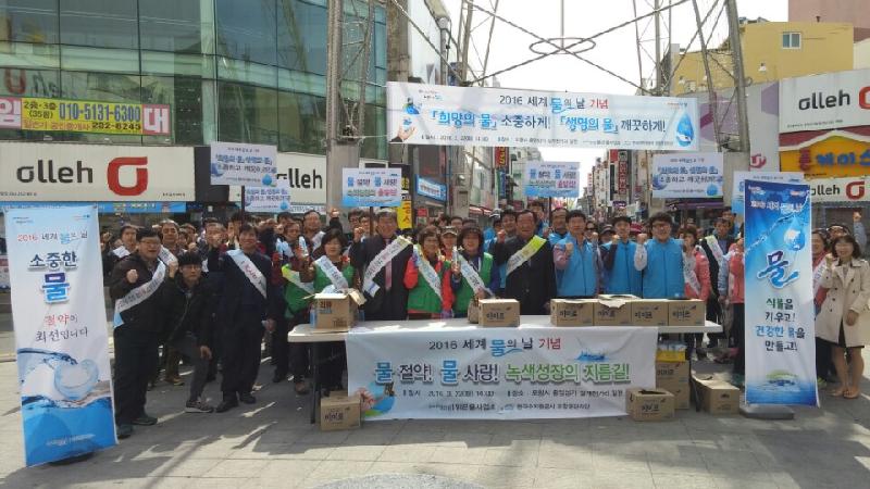 포항시 맑은물사업소는 22일 중앙상가 실개천거리 일원에서 2016년 세계 물의 날을 기념해 ‘물절약·물사랑 캠페인’을 전개했다. 3월 22일은 1992년 제47차 유엔총회에서 ‘세계 물의 날’로 지정·선포됐으며, 우리나라는 1995년부터 정부차원의 기념식 및 행사를 실시해 올해가 21주년이 되는 해이다. 올해 포항시 물절약·물사랑 캠페인에서는 포항시 맑은물사업소와 K-Water 직원, 민간단체 등 150여명이 참여한 가운데, (구)포항역 사거리에서 북포항우체국 및 육거리 일대까지 이동하며 물절약을 당부하는 거리캠페인을 실시했다. 또한 행사 운영본부가 설치된 북포항우체국 앞에서는 시민들을 대상으로 약 2시간 동안 물절약 실천 홍보 캠페인뿐만 아니라 물사랑 사진전시회도 가졌다. 특히, 시는 한국수자원공사(K-Water) 포항권관리단의 협조를 받아 중앙상가 실개천 일대에서 수돗물의 안정성과 물절약·물사랑 실천을 위한 20여점의 사진을 전시하고, 수돗물(병물) 시음회를 갖는 등 먹는 물의 중요성 인식제고 및 시민 공감대 확산에 크게 기여했다. 최만달 맑은물사업소장은 “이번 행사를 통해 설거지, 목욕, 세탁 등 일상생활 속에서 물 절약을 생활화하고 습관화해 생명의 원천인 물을 사랑하는 데 다 같이 동참할 수 있는 계기가 되기를 바란다”고 말했다. 한편 시는 이날 행사를 마치고 형산강 상수원보호구역으로 이동해 세계 물의 날 기념한 지역 연계행사로 쓰레기 수거 등 자연정화활동도 병행 추진했다.