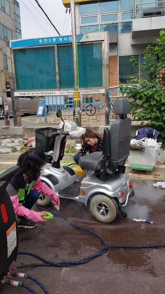 부평구 청천보건지소는 15일 청사 외부 주차장에서 장애인들을 대상으로 이동보조기기 세척 서비스를 실시했다.