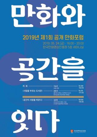 한국만화영상진흥원이 오는 24일 오후 4시, 5층 세미나실에서 2019년 제1회 공개 만화포럼 ‘만화와 공간을 잇다’를 개최한다.