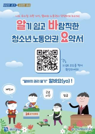 경기도는 청소년 노동인권 매뉴얼 ‘알바요’를 모바일로 누구나 쉽게 접할 수 있도록 큐알코드 스티커 및 포스터로 제작해 이달 말까지 도내 중고등학교 및 대학교에 배포한다고 16일 밝혔다.
