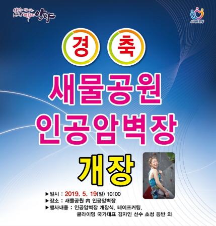 안양 새물공원 인공암벽장 개장식과 이를 기념하는 2019 안양시장배 전국 스포츠클라이밍 대회가 오는 19일 현장에서 열린다.