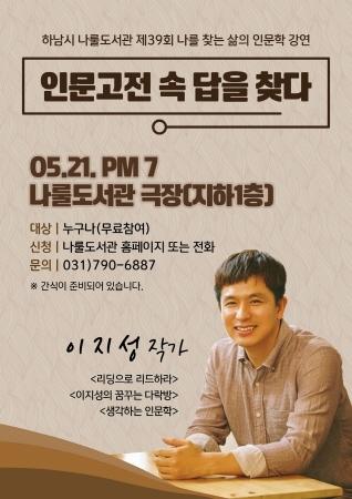 하남시 나룰도서관은 오는 21일 오후 7시 나눌도서관도서관극장에서 ‘인문고전 속 답을 찾다’라는 주제로 제39회 나를 찾는 삶의 인문학 강연을 개최한다고 밝혔다.