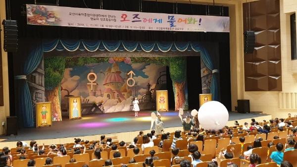 오산시육아종합지원센터는 지난 15일 오산시 문화예술회관 대공연장에서 관내 어린이집 영·유아 940여명을 대상으로 성교육 뮤지컬 ‘오즈에게 물어봐’ 공연을 성황리에 개최했다.