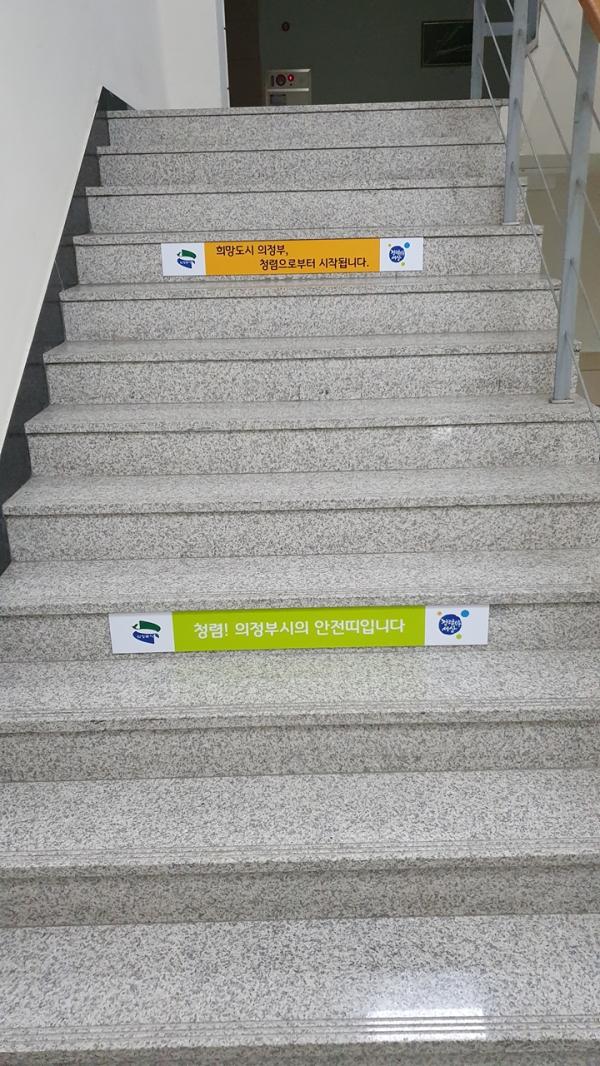 ‘청렴으로 당당한 당신이 아름답습니다’, ‘우리의 청렴지수, 의정부의 행복지수’, ‘함께해요 청렴실천 함께가요 밝은미래’ 등 다양한 청렴 의지를 담은 문구를 직원들이 계단을 디딜 때 마다 자연스럽게 몸과 마음으로 느끼면서 청렴의식을 제고하기를 기대하고 있다.