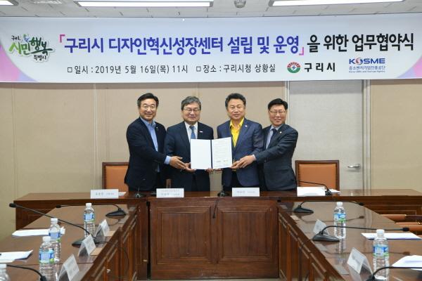 시는 16일 구리시청에서 안승남 구리시장, 박석윤 구리시의회 의장, 윤호중 국회의원, 이상직 중소벤처기업진흥공단 이사장 등이 참석한 가운데 중소벤처기업진흥공단과 “디자인혁신성장센터 및 청년창업사관학교 설립”을 위한 업무협약을 체결했다.
