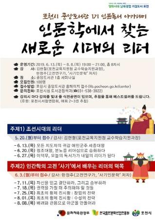 인문독서아카데미는 인문학 강의를 통한 전 시민 인문정신 고양 및 독서문화 확산을 위한 사업으로 포천시 중앙도서관은 올해 ‘인문학에서 찾는 새로운 시대의 리더’라는 주제로 1기와 2기로 나눠 총 15회 강의를 진행한다.