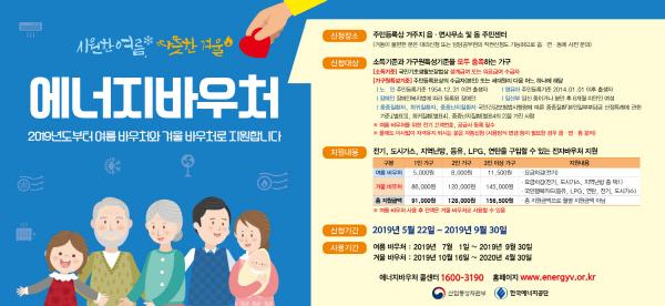 기존 에너지바우처 사업은 겨울철 난방이 어려운 취약계층에 전기·도시가스 등의 요금을 차감하는 가상카드 또는 등유·연탄 등을 구입할 수 있는 실물카드 형태의 바우처를 지급하는 에너지복지 사업이었으나 올해부터는 여름철 냉방비도 지원하게 되며 겨울철 에너지바우처 신청이 별도로 없으니 지원 대상자는 빠짐없이 신청해야 한다.