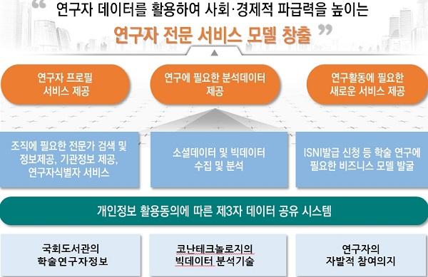 국회도서관은 인공지능 기반 빅데이터 소프트웨어 전문기업인 ㈜코난테크놀러지와 협업해 국회도서관이 보유한 학술연구자정보에서 본인의 정보를 스마트폰에 내려 받아 저장·관리하고, ISNI 발급, 연구주제 동향분석, 연구자 구인구직 연계서비스, 기관-전문가 매칭 서비스 등을 제공하는 앱을 개발해 올해 하반기 안에 국민 누구나 사용할 수 있도록 서비스할 계획이다.