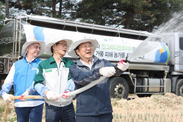 17일 오전 엄태준 이천시장은 오비맥주 고동우 대표 , 구자규 인그리디언코리아 대표와 함께 이천시 대월면 사동리 가뭄 피해 농가를 찾아 약 20톤의 용수를 공급했으며, 오비맥주는 갈수기인 6월 중순까지 농업용수 수질기준에 적합 판정을 받은 800톤 가량의 물을, 인그리디언코리아를 통해 용수 공급차량으로 지원할 계획이다.