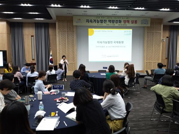 ‘지속가능발전의 개념과 국제 동향’을 주제로 강연한 박연희 이클레이 한국사무소장은 “지속가능발전은 지구환경 보전을 위해 자연이 허용하는 범위 내에서 경제·사회·환경이 균형을 이뤄 조화롭게 발전하는 것”이라며 “지속가능발전을 하려면 지방정부가 중요한 역할을 해야 한다”고 강조했다.