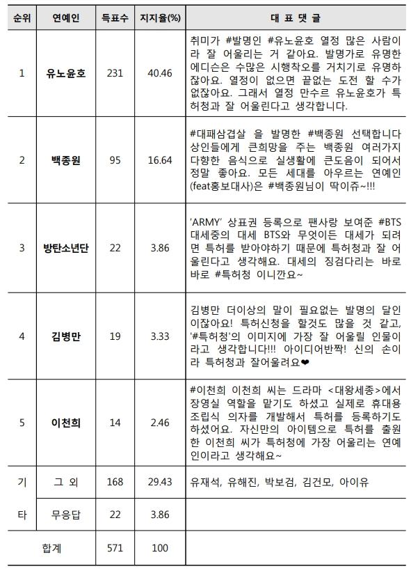 이번 조사는 지난 4월 26일부터 15일간 일반 국민들이 특허청 페이스북 댓글로‘특허청과 가장 잘 어울리는 연예인’을 한명씩 추천하는 방식으로 진행됐다.