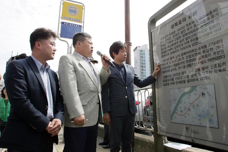| 17일 나상성 광명시의장과 김정호 의원은 관계자로부터 광복로 지명알리기 현판에 대한 설명을 듣고 있다. |