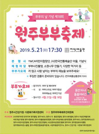 원주시와 원주시건강가정·다문화가족지원센터에서 주최하고 원주부부축제 추진위원회가 주관하는 이번 행사에서는 부부가요제 본선 진출팀의 경연을 시작으로 YWCA어린이 합창단과 한국전통예술단 아울의 공연이 펼쳐진다.