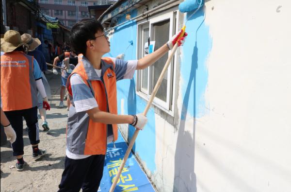 사)동두천시종합자원봉사센터는 지난 18일 9시 제15기 한마음 가족봉사단과 동두천여자중학교 미술동아리 학생 등 80명이 중앙동 6통 골목에 벽화그리기 작업을 위한 초벌 도색작업을 실시했다.