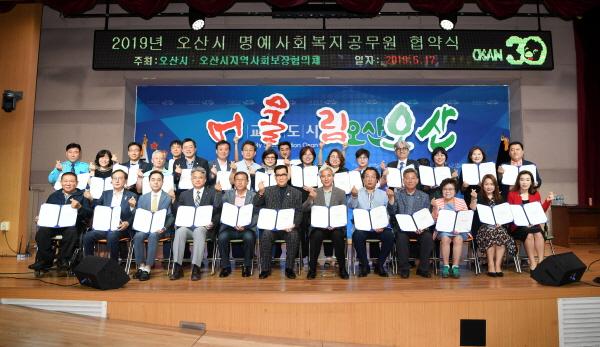 오산시는 지난 17일 오산시청 대회의실에서 복지사각지대 발굴 및 지역의 촘촘한 복지 인적안전망을 구축을 위해 오산시 명예사회복지공무원으로 신청한 42개의 단체와 신규 위촉자 400여명의 시민이 참석한 가운데 ‘오산시 명예사회복지공무원 협약식 및 교육’을 개최했다.