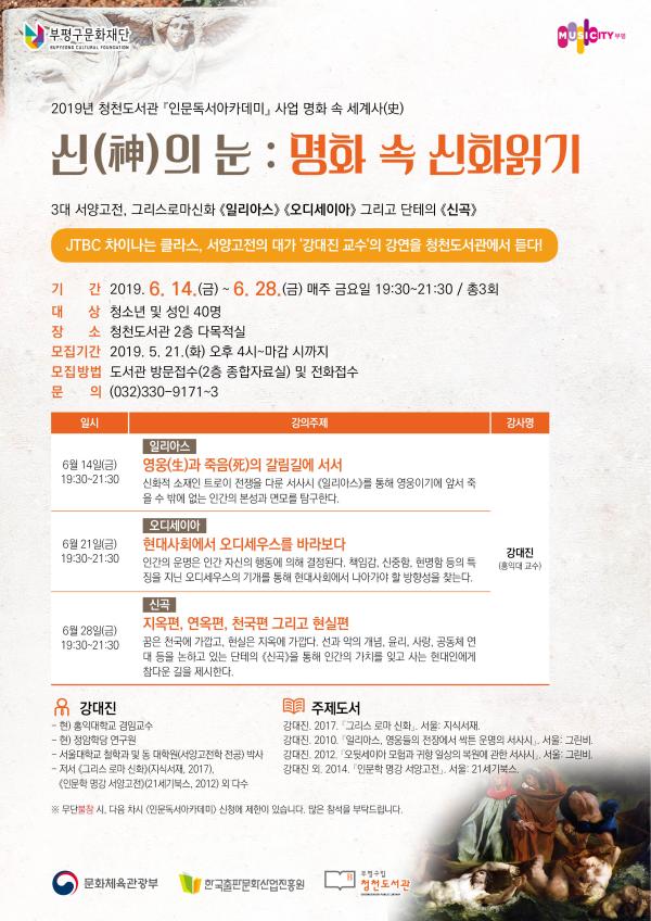 부평구 청천도서관은 ‘2019년 인문독서아카데미 제1차 프로그램, 신의 눈: 명화 속 신화읽기’를 운영한다.