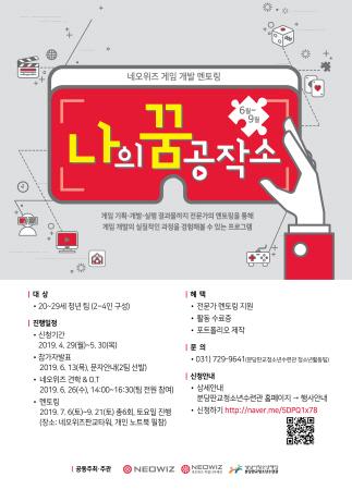 성남시청소년재단 분당판교청소년수련관은 게임 IT 전문기업 ㈜네오위즈, 네오위즈 마법나무재단과 공동 운영하는 게임 개발 멘토링 ‘나의 꿈 공작소’의 참가팀을 모집하고 있다.