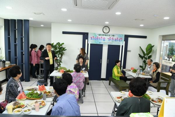 ‘치매 치유 가든파티’는 경증 치매환자 돌봄 쉼터의 인지 기능 향상 프로그램 중에 하나인 원예 치료 프로그램 운영에 따라 쉼터 텃밭에서 직접 기른 채소류와 함께 음식을 나눠 먹는 가든파티를 여는 프로그램이다. 이를 통해 치매환자들의 성취감을 증진시키고 치매 환자와 가족들과 간의 소통과 화합의 장을 마련하는 자리이다.