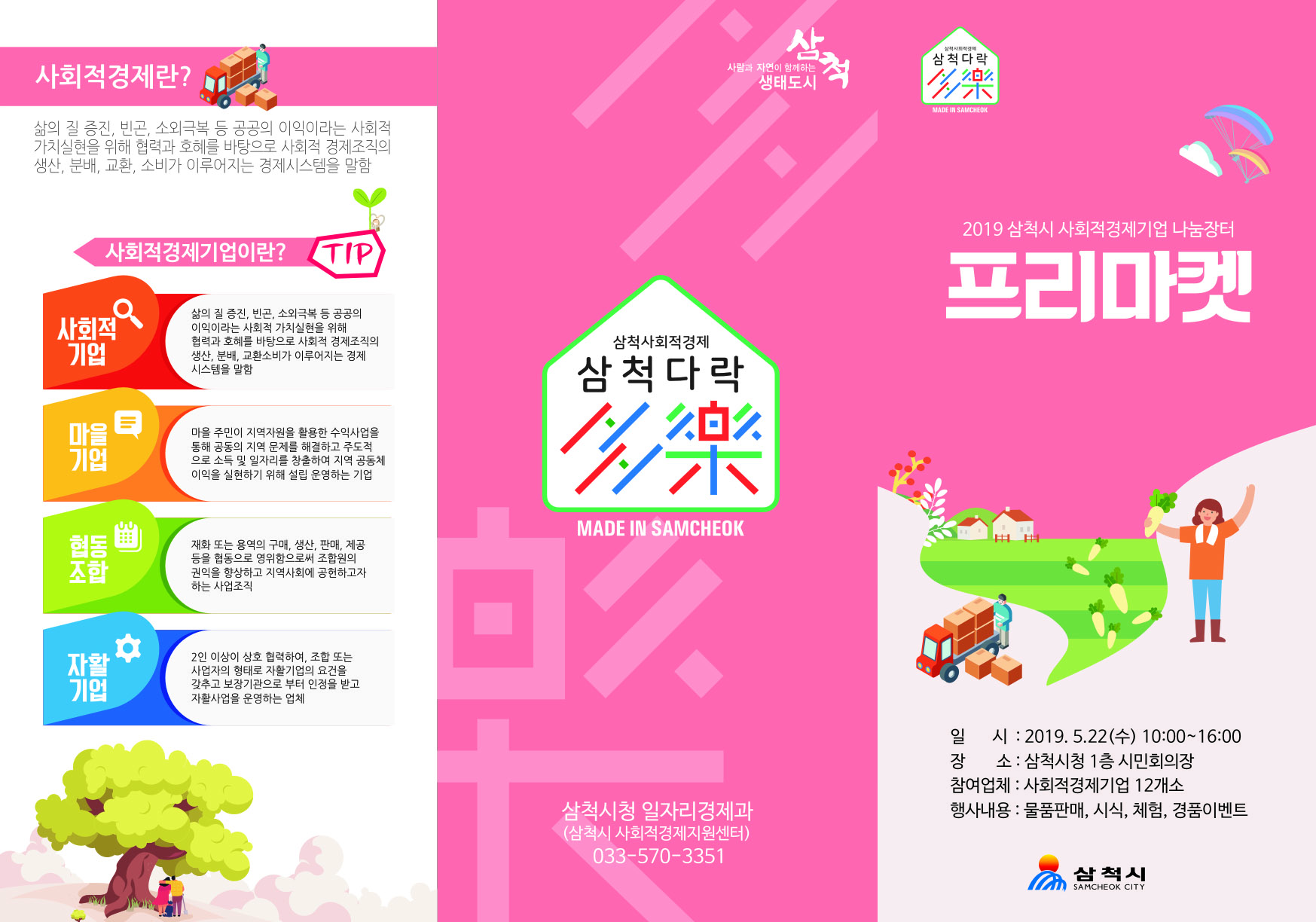 삼척시가 사회적경제기업의 판로확보와 활성화를 위한 2019년 자치단체 지역특화사업 공모에 선정되어 사회적경제기업 나눔장터인 ‘5월 프리마켓’을 오는 22일에 시청 1층 시민회의장에서 개최한다.