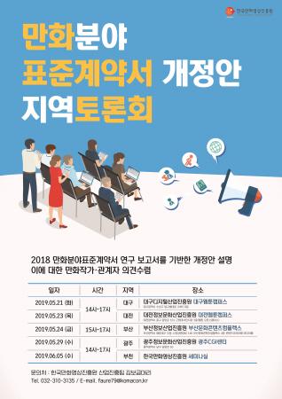 한국만화영상진흥원은 21일부터 2주 동안 ‘만화분야 표준계약서 개정안 지역토론회’를 개최한다.