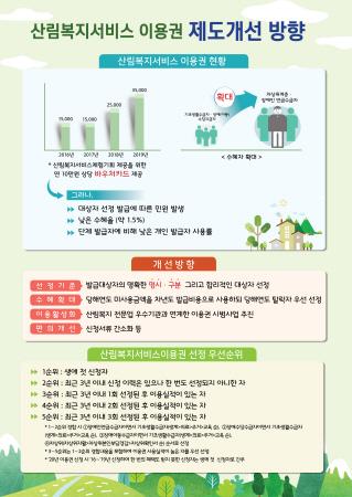 이미라 산림복지국장은 “이번 개선안 마련으로 산림복지서비스이용권 제도에 대한 형평성과 행정의 투명성이 높아질 것으로 기대한다.”라며, “앞으로도 보다 많은 사회취약계층을 위한 포용행정으로 정부혁신을 추진할 것”이라고 말했다.