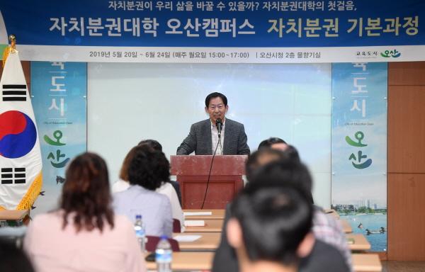 2019년 자치분권대학 오산캠퍼스는 오산시와 자치분권지방정부협의회의 협조 속에 개설되었으며, 6주간 매주 월요일마다 2시간씩 자치분권의 이해를 돕기 위한 기본과정으로 진행된다. 이날 각계 각층의 시민과 공무원 등 60명의 수강생이 참석하였으며, 축하영상 및 자치분권대학 소개, 부시장님의 수강증 수여 등의 개강식 후 1주차 강의로 진행됐다.