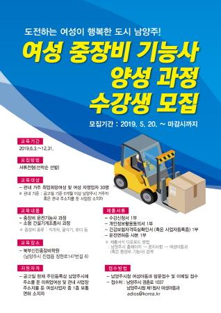 남양주시는 오는 31일까지 지역내 거주 미취업 여성 및 여성 자영업자를 대상으로 ‘2019 중장비 기능사 양성과정’ 참여자를 모집한다.
