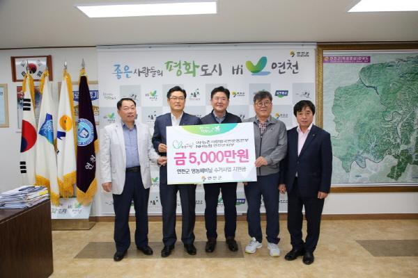 22일 NH농협 연천군지부 지부장과 관내 3개 농협 조합장은 깨끗하고 아름다운 농촌마을 가꾸기 사업의 일환으로 농촌사랑 영농 폐비닐 수거 사업을 위해 연천군에 5천만원을 지원하는 기부금 전달식을 가졌다.
